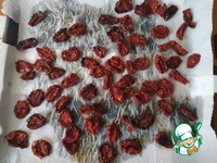 Духовку нагреть до 60–100 градусов. Поставить противень с помидорами в духовку (дверцу духовки держать слегка приоткрытой, чтобы влага быстрее испарялась). Если духовка имеет функцию конвекция, то иногда, можно понижать температуру и включать конвекцию. Вялятся помидоры 3-4 часа, смотрите по своей духовке. |