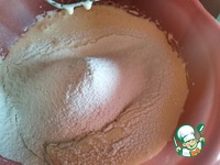 Затем влить кефир и яблочный сок. Добавить просеянную муку с разрыхлителем. Перемешать. (Я быстро взбила миксером.) |