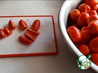 Нарезаем помидоры на половинки, помидоры побольше на четыре части. |