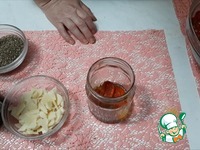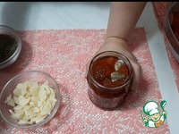 В стерелизованную банку выкладываем чеснок, приправу итальянские травки, немного оливкового масла и слой помидоров. |