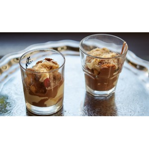 Для подачи выкладываем слоями в следующем порядке: шоколадный крем, заварной крем, савоярди, заварной крем, шоколадный крем, фрукты, заварной крем, шоколадный крем, украшаем кокосовой стружкой и крошкой из савоярди.