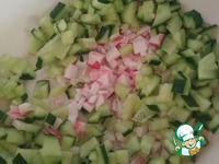 Огурцы, зеленый лук, вареные яйца и крабовые палочки порубить или нарезать мелким кубиком. |