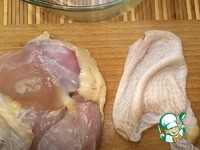 2) Куриное бедро промываем, обсушиваем и отрываем кожицу. |
