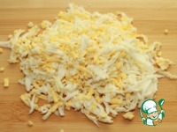 Второй слой - натертые на средней терке отварные яйца. |