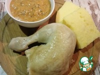 Курицу помыть и варить до готовности на слабом огне постоянно снимая пену, посолить по вкусу. Готовую курицу достать и разделить на порционные куски |
