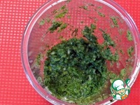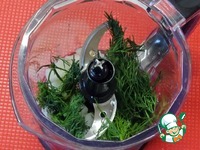 В измельчитель выложить разрезанный лук, 1 зубчик чеснока, укроп. |