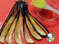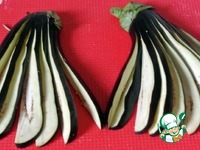 Баклажан вымыть, обсушить, разрезать на 2 части вдоль. Каждую половинку баклажана надрезать на 5-6 частей. |