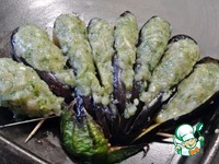 Каждую часть разрезанного баклажана свернуть, закрепить зубочисткой. Заполнить фаршем. |