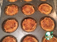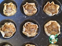 Очень тонко раскатываем тесто, из подручной кружки - стакана вырезаем кружок и выкладываем его в каждую ячейку формы. |
