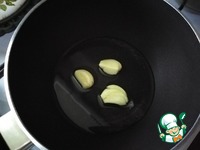 В сотейнике греем масло и выкладываем зубчики чеснока, раздавленные плоской стороной ножа. Обжариваем их до бежевого цвета с минуту, чтобы чеснок отдал свой аромат маслу. |