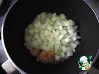 Выкладываем порезанный мелко лук. Чеснок можно убрать (выкинуть). Золотим лук до мягкости. |