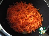 Выкладываем натёртую морковь. Перемешиваем. Я буду овощи томить под крышкой на минимальном огне. |