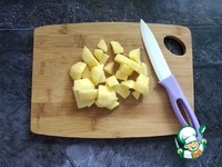 Картофель нарезала небольшим кубиком. Когда бульон закипел, выложила в него картофель, чтобы он сварился. Паралельно делать буду заправку для супа. |