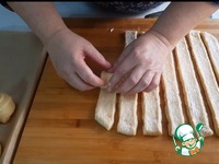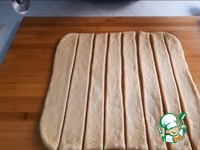Делим тесто на 2 части. Раскатываем каждый кусочек в пласт толщиной 7 мм. Смазываем сливочным маслом и нарезаем на полоски толщиной 3-3.5 см. |