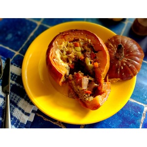 Описание: Тыква фаршированная овощами и киноа с беконом и Сулугуни. Заполните тыквенный горшочек начинкой и вы получите необыкновенное красивое горячее блюдо, которое можно приготовить и на праздничный стол.