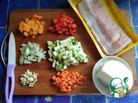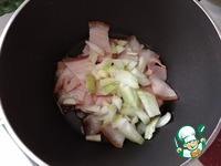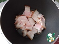 Ломтики бекона нарезаем на кусочки примерно 2,5 см шириной и отправляем в сотейник растопиться. |