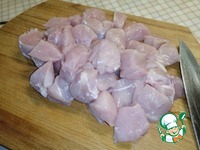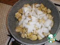 Лук нарезать крупными кубиками, добавить в сковороду к куриному филе. |