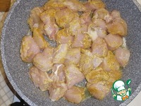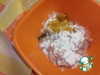 К порезанному филе добавить муку и куркуму. Посолить и поперчить по вкусу. Хорошо перемешать. |