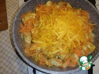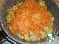 Морковь натереть на крупной тёрке, добавить в сковороду к остальным ингредиентам. Перемешать. Готовить 3 минуты. |