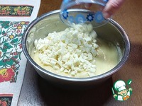 Сюда же отправляем 70 г измельчённого белого шоколада. Хорошенько всё перемешиваем, чтобы шоколад равномерно распределился по тесту. |