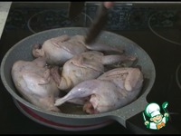Выкладываем перепела и обжариваем до румяной корочки со всех сторон. |
