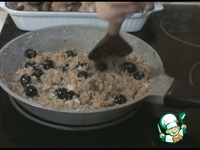 Добавляем 100 грамм маслин без косточек. Я добавила целыми, но если хотите, можете измельчить их. Обжарим начинку минут 5, потом снимаем её с огня и перекладываем в другую посуду. |
