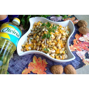 Смешать перец, орехи и кукурузу. |