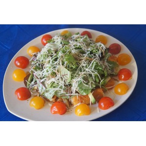 Описание: Воистину, это бесподобный салат. Я заказала его в Черногории на отдыхе и просто влюбилась в него. Единственное, только у меня сулугуни вместо моцареллы, но это вполне допустимо, они похожи по консистенции и вкусу.