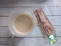 Бекон не принципиально какой брать. У меня сырой. Полоски длинные и я их разрежу пополам. Очень вкусно будет с копчёным беконом. |