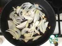 Чеснок (3 зуб.) нашинковать пластиками, добавить на раскаленную сковороду чеснок и слегка обжарить, далее добавить нарезанный репчатый лук. |
