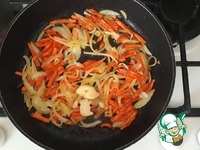 Далее добавить морковную соломку. Спассеровать лук и морковь до легкой золотистой корочки. |