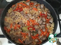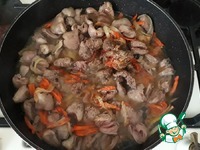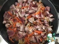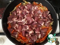 В сковороду с пассерованными овощами добавить куриные сердечки (400 гр.) |