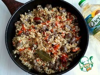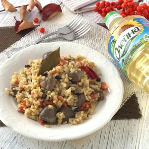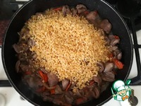 Далее выложить булгур в сковороду с куриными сердечками, добавить 1 ст. ложку топленого сливочного масла, добавить воду с таким расчетом, чтобы она слегка покрывала булгур. |