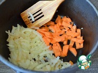В казане или толстостенной кастрюле на растительном масле обжарить лук, 3 минуты, огонь средний. Добавить брусочки моркови, жарить ещё 3 минуты. |