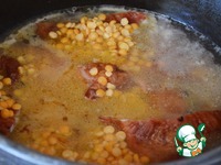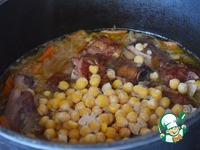 Горох промыть, добавить с сахаром в казан и влить 2 стакана кипятка, варить 20-30 минут, зависит от сорта гороха. |