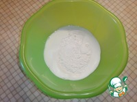 В глубокую миску просеять муку, добавить соль. Влить комнатной температуры молоко. Хорошо меремешать. |