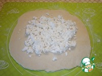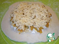 Брынзу натереть на крупной тёрке. Выкладываем первым слоем отступив от края 3-4 см. |