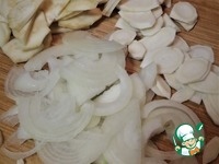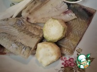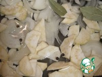 В сотейник положить нарезанные коренья, лук, перец (горошек), лавровый лист, залить разбавленным рассолом.