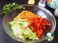 Для салата овощи помыть, нарезать тонкими ломтиками. Сладкий перец соломкой. |