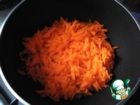 Натираем морковь на тёрке и отправляем к луку. Я буду томить и поэтому убавлю огонь на минимум, накрою крышкой. |