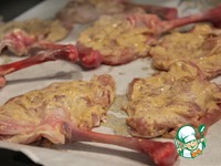 Замаринованные куриные отбивные на косточке уложить на противень, застеленный пергаментом для выпечки. Запекать в духовке при 180 градусах около 15 минут. |
