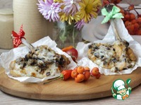 Когда отбивные запекутся, вынуть из духовки, выложить наверх начинку из грибов и посыпать мелко порезанной моцареллой. Снова поставить в духовку на 5 минут до расплавления сыра. |