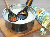 1. Отвариваем рис до полуготовности, воду сливаем. Добавляем в рис соевый соус 2 ст. л. и подсолнечное масло 1-2 ст. л., перемешиваем. |