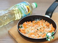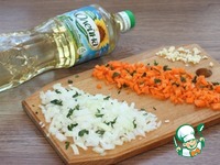 6. Приготовим начинку. Овощи очищаем и нарезаем, лук и морковь - кубиками, мелко рубим чеснок. |