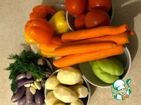 1. Моем овощи и укроп. Очищаем картофель и морковь от кожицы. Чистим чеснок. 2. Перец чистим от хвостиков и семян. У помидора вырезаем черешковою часть. |