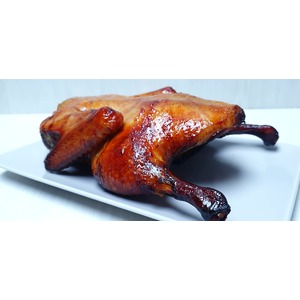 Смешать ингредиенты для второго маринада. С помощью кисточки смазать утку маринадом (1/3 часть) Убрать в холодильник на 30 минут. Снова нанести примерно 1/3 маринада и убрать в холодильник на 30 минут. Затем ещё раз смазать (оставив немного маринада) и убрать в холодильник на два часа. Достать и дать утке согреться на столе около 30 минут. На противень поставить решетку, положить утку и прикрыть фольгой так, чтобы она не касалась утки. Запекать в разогретой духовке до 230°С, 45 минут. Достать утку, снять фольгу и положить утку спинкой вверх. Смазать маринадом и запекать при 140° С, 45 минут. Затем перевернуть утку грудкой вверх, смазать маринадом и запекать еще 45 минут при 140°С. За 10 минут до окончания включить гриль или конвекцию. Ориентируетесь на особенности своей духовки.