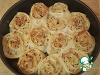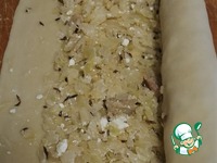 Тесто раскатать прямоугольником, положить начинку и скатать рулетом. |