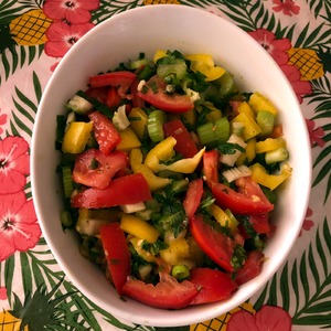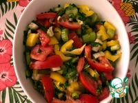 Описание: Пикантный салатик с черешковым сельдереем, зеленью и болгарским перчиком, который содержит необходимое количество клетчатки для поддержания здоровой микрофлоры кишечника и обогащения организма полезными веществами. Необычный вкус салату придают оливки, каперсы и молотый кориандр.