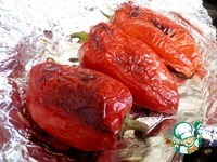 Перцы помыть, наколоть вилкой. Запечь перцы в духовке до коричневых подпалин. Температура духовки 200 градусов, запекать минут 25. Завернуть в пакет и дать пропотеть, чтобы было проще снять шкурку. |