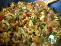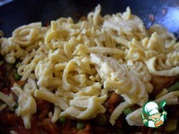 Стараемся перемешать всю лапшу с остальным составом, заодно прогреваем. |